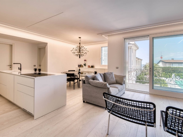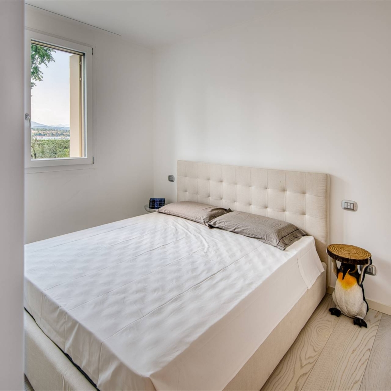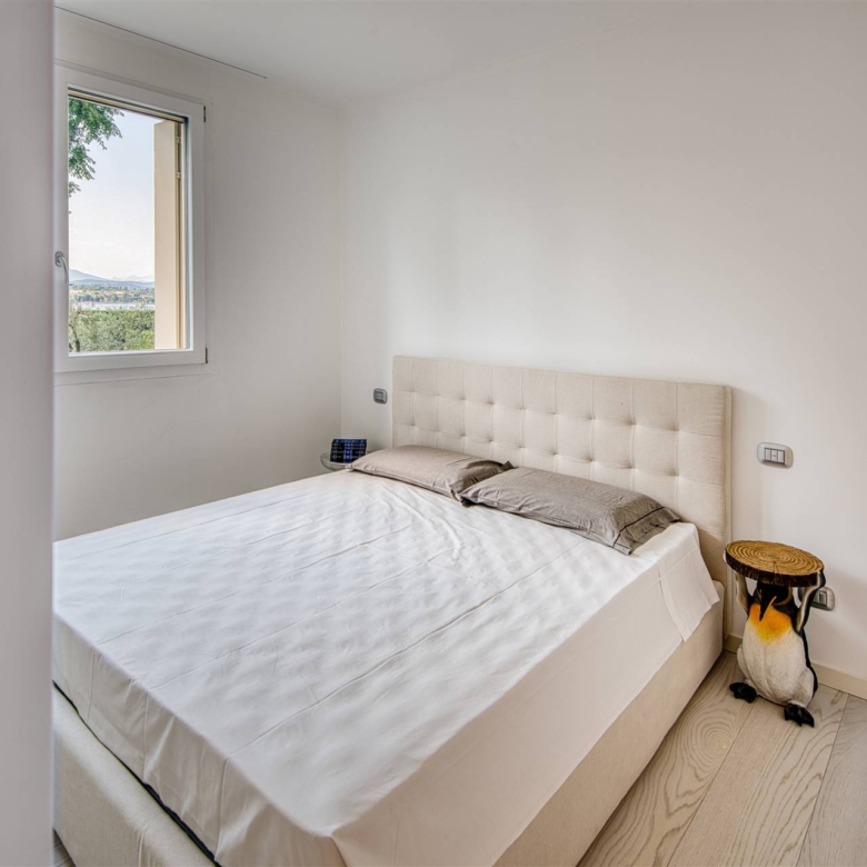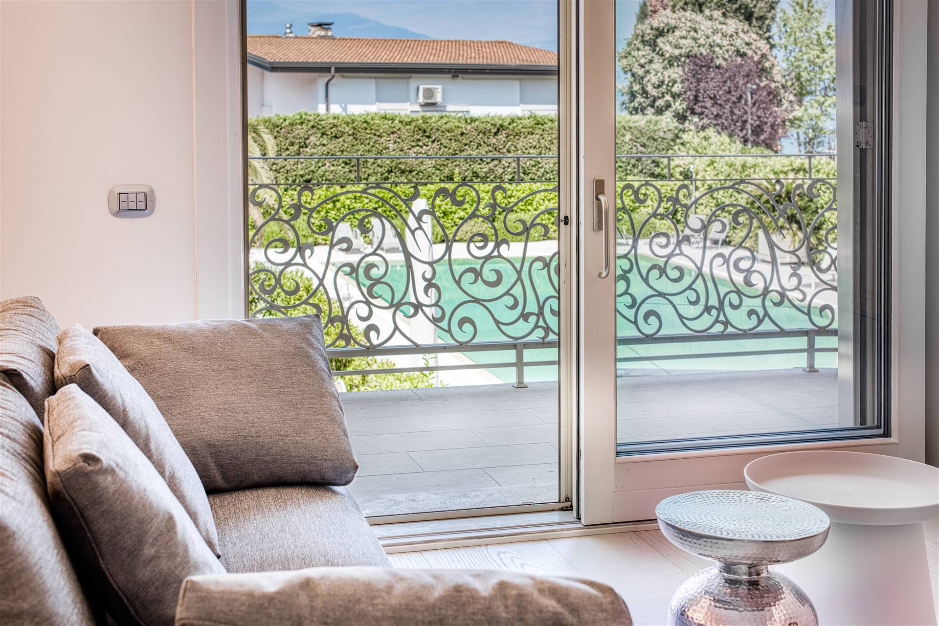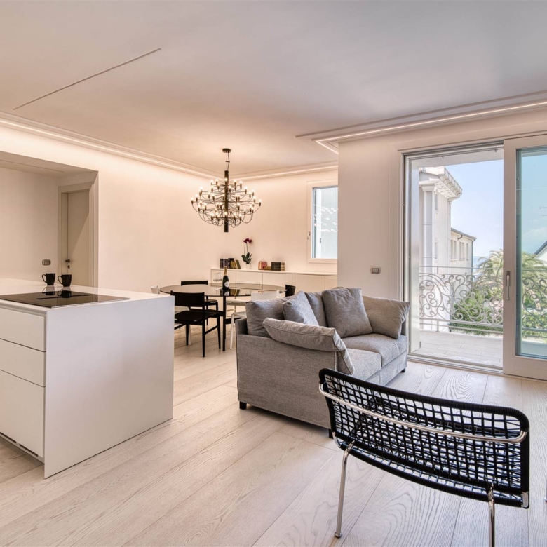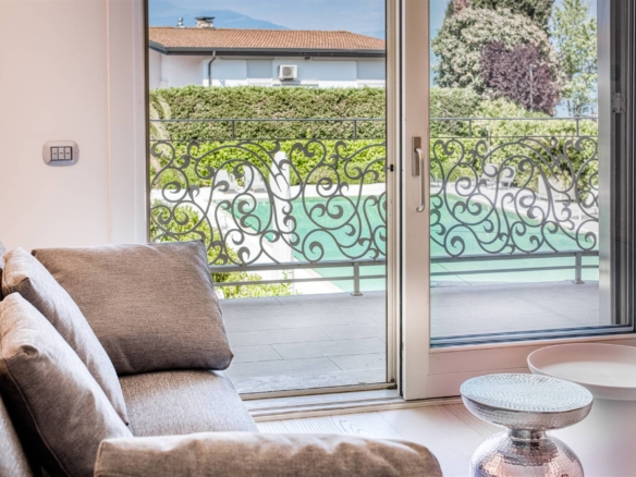 Lo splendido affaccio sulla piscina e verso il lago ci accolgono appena entrati nell’appartamento, posto al primo piano servito da ascensore, direttamente nella zona living molto generosa con cucina a vista e una splendida terrazza. Gli ambienti giorno sono eleganti e raffinati, resi straordinariamente luminosi da ampie vetrate panoramiche e dai giochi di luci studiati da noto architetto.