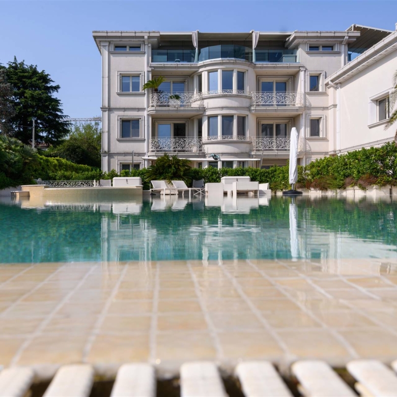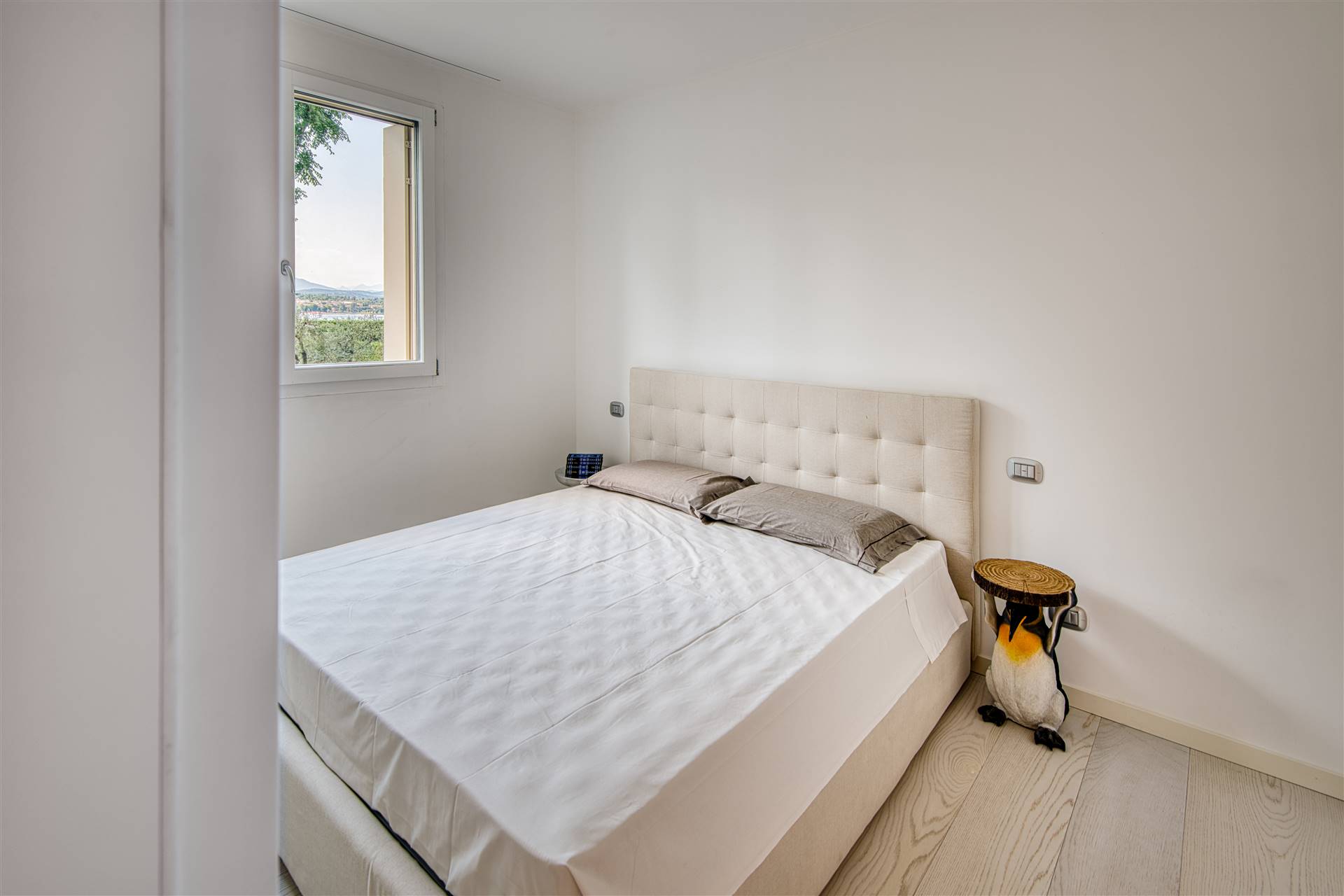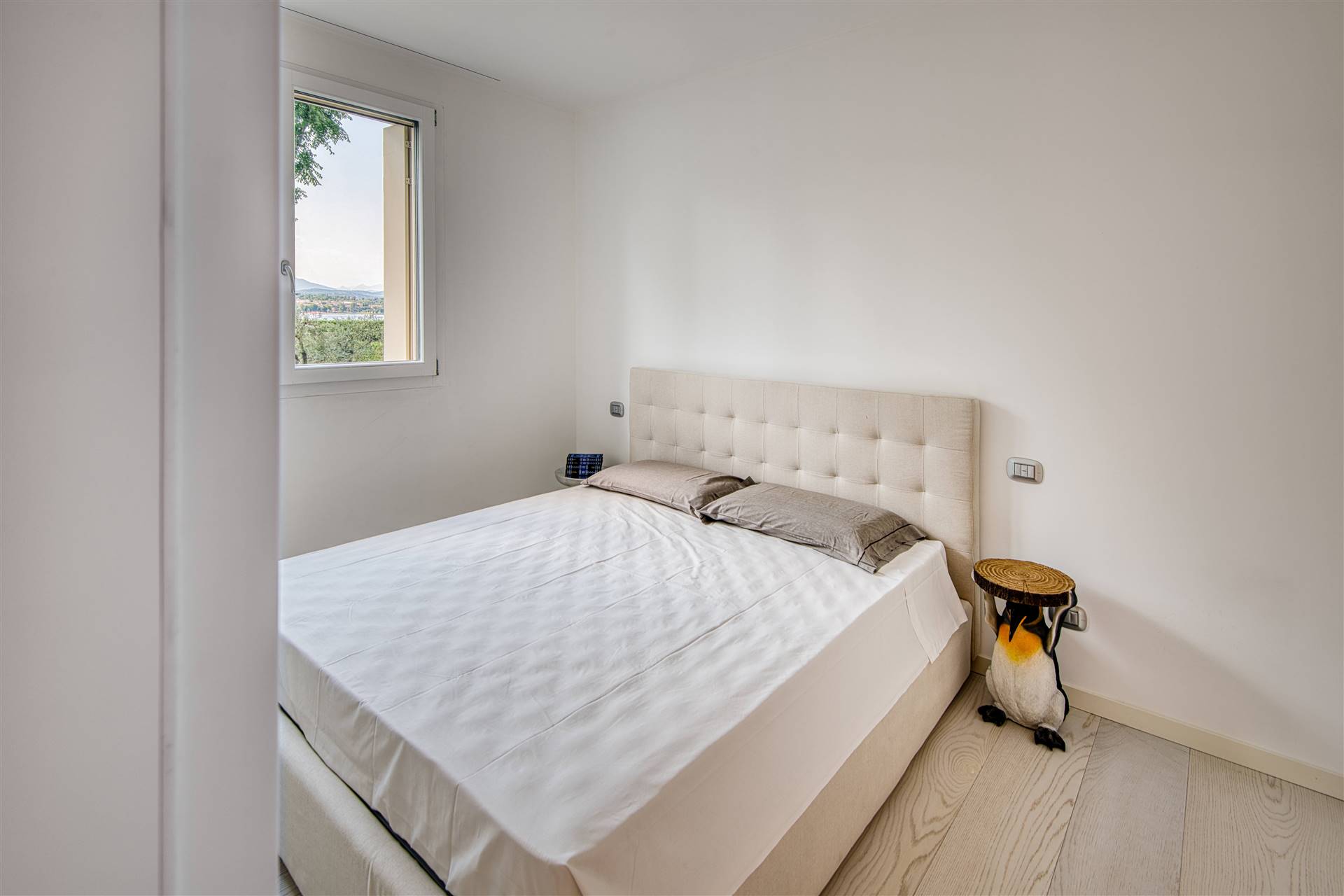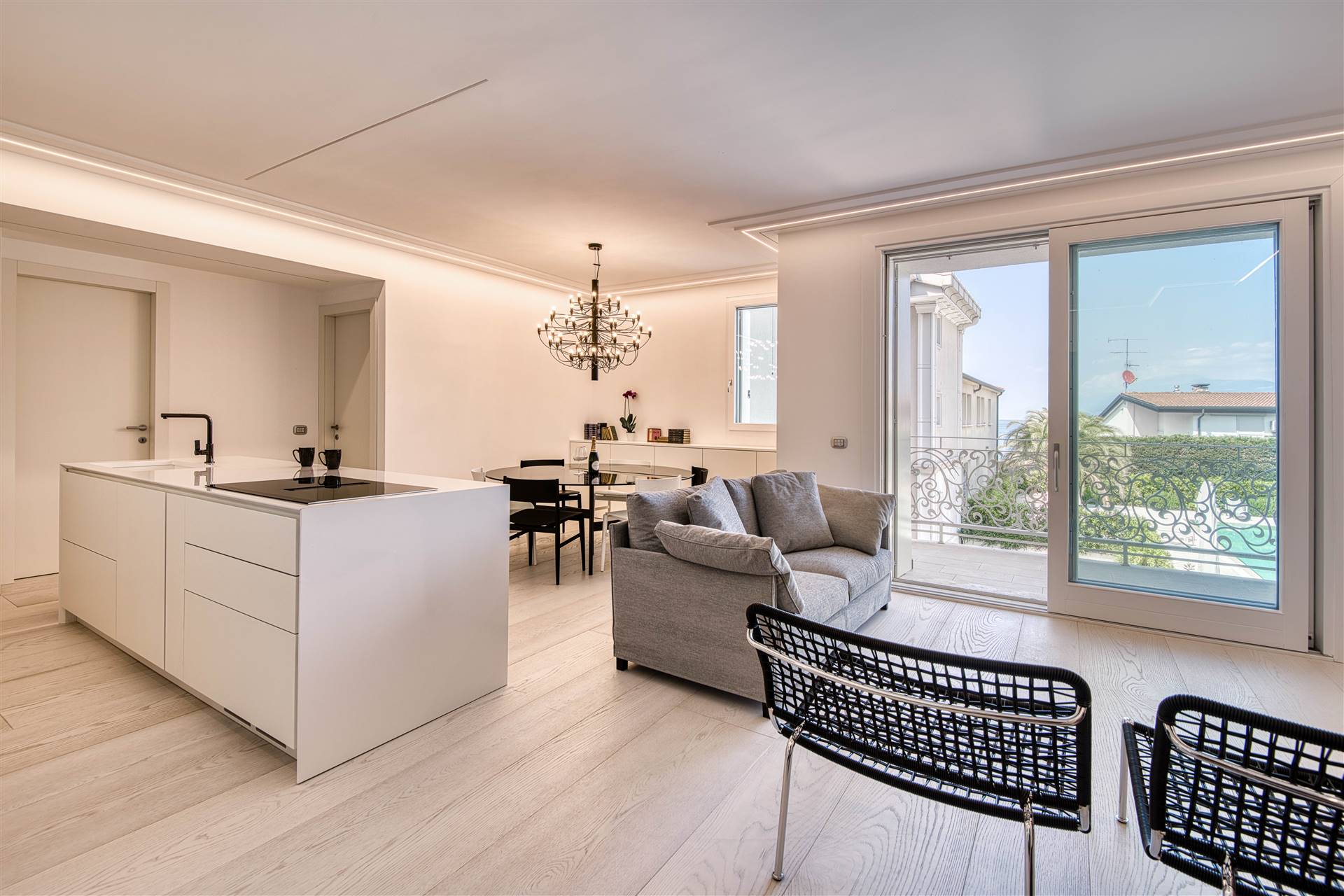 Lo splendido affaccio sulla piscina e verso il lago ci accolgono appena entrati nell’appartamento, posto al primo piano servito da ascensore, direttamente nella zona living molto generosa con cucina a vista e una splendida terrazza. Gli ambienti giorno sono eleganti e raffinati, resi straordinariamente luminosi da ampie vetrate panoramiche e dai giochi di luci studiati da noto architetto.