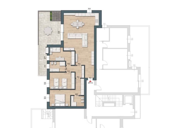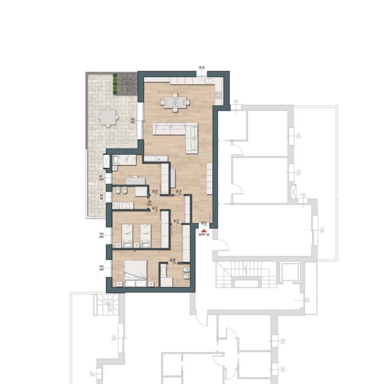L’appartamento gode di un grande terrazzo coperto dove godere degli spazi aperti, grandi vetrate , dove si apre un grande soggiorno, cucina a vista, disimpegno, bagno ,camera singola e camera matrimoniale con suite cabina armadio e bagno di pertinenza. Ascensore .