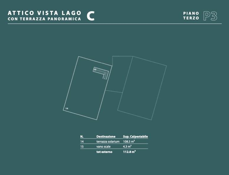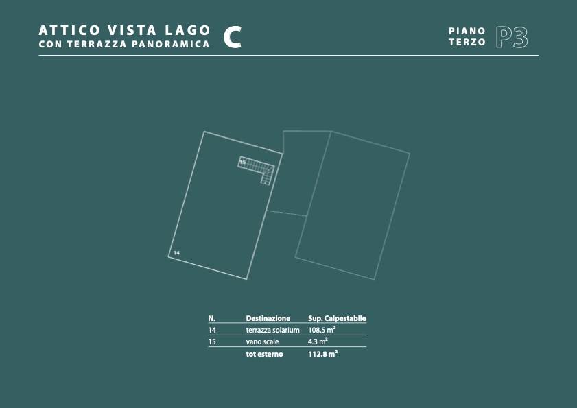 Meraviglioso il solarium sul tetto con vista panoramica del lago e predisposizione di mini piscina o idromassaggio.