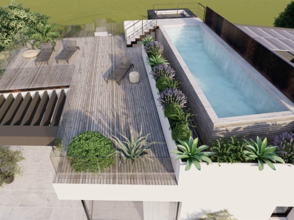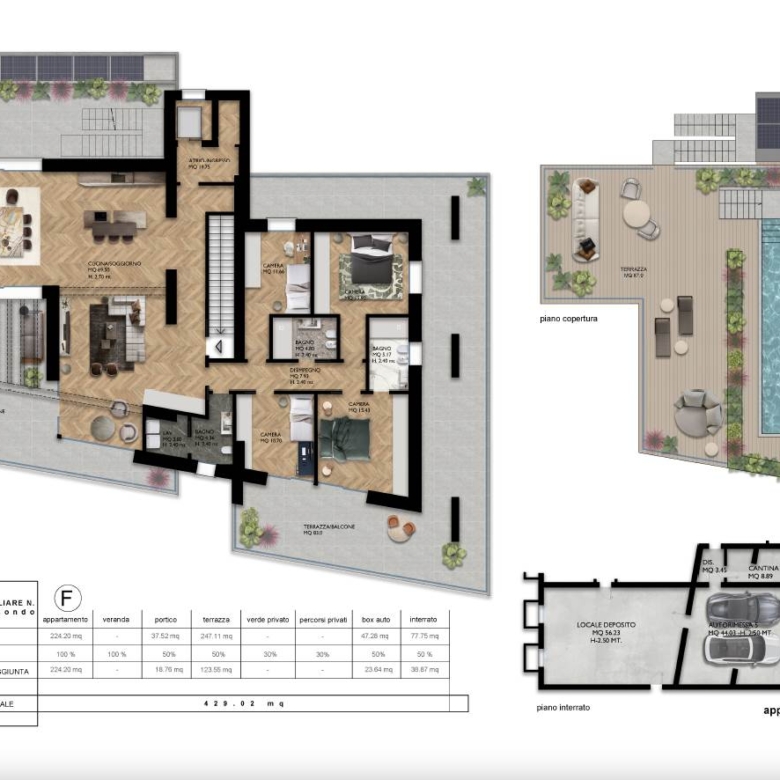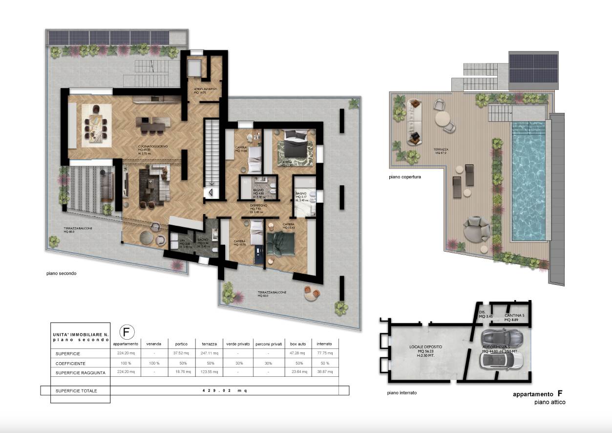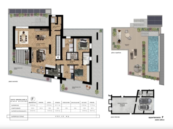 La proprietà, in condizioni di nuova costruzione, dispone di riscaldamento centralizzato, condizionatore e ingresso condominiale. Completano l’attico una terrazza di 99 mq al terzo piano, una terrazza di 181 mq al quarto piano e un portico/patio di 15 mq al terzo piano. Inoltre, è presente un box/garage di 85 mq al piano interrato.