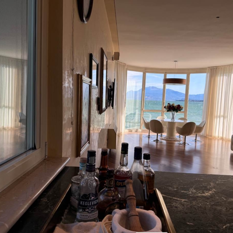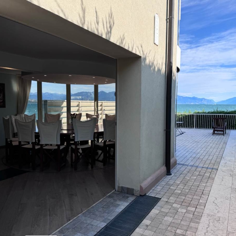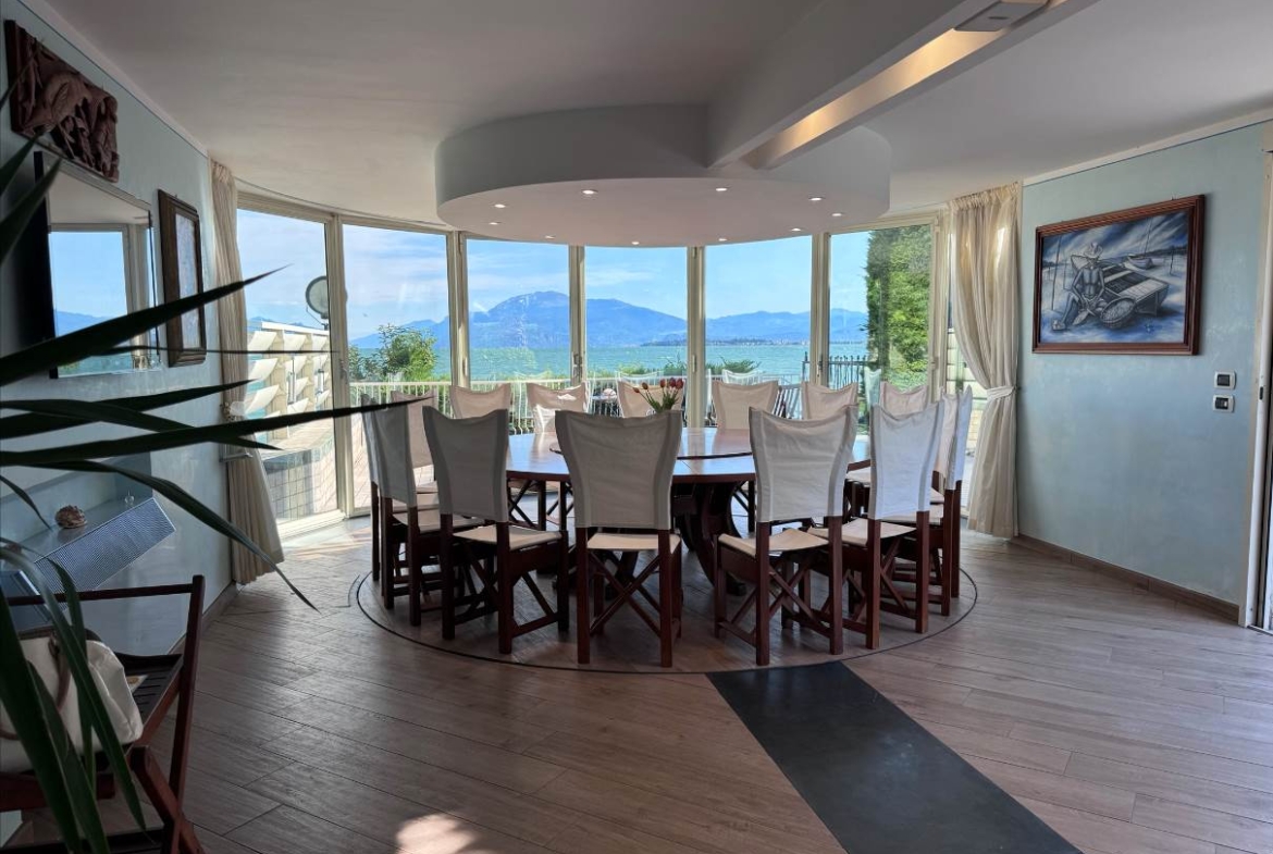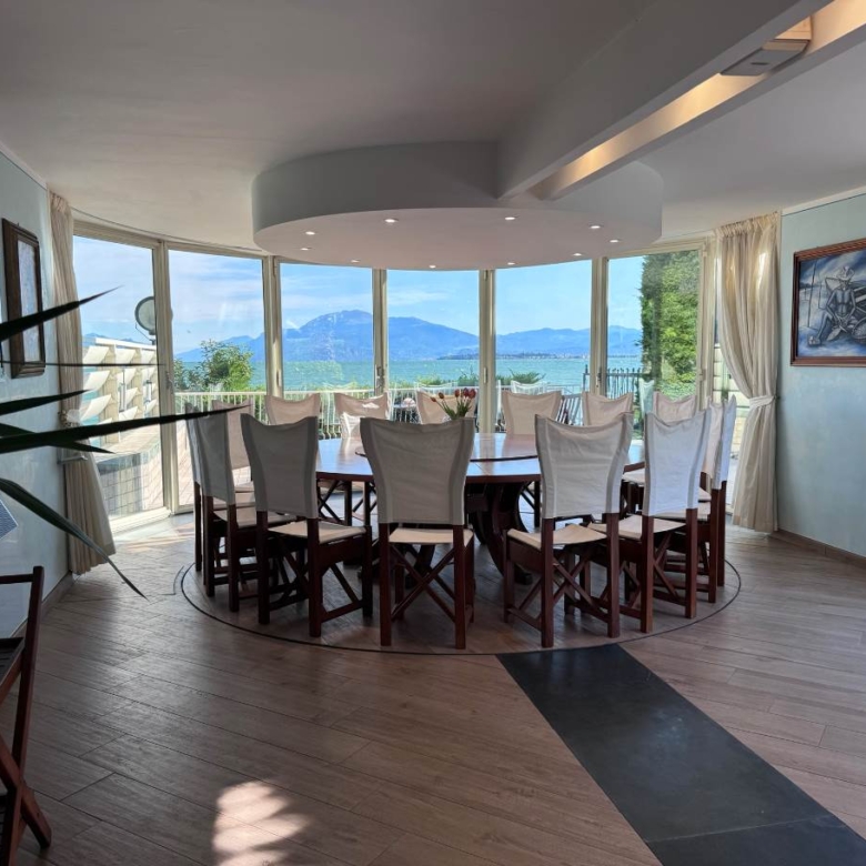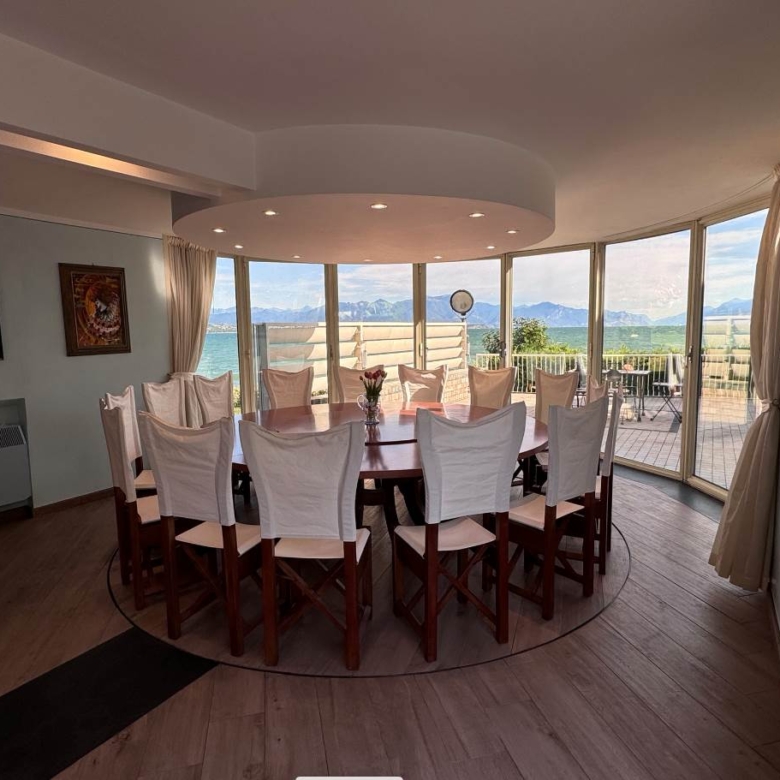 Al piano terra troviamo la prima zona living molto luminosa con accesso diretto sia alla terrazza di 50 mq fronte lago sia alla piscina condominiale, cucina a vista, bagno di servizio, ripostiglio con locale tecnico; l’ importante tavolo con pedana rotante permette a tutti i commensali una vista incantevole su Sirmione.