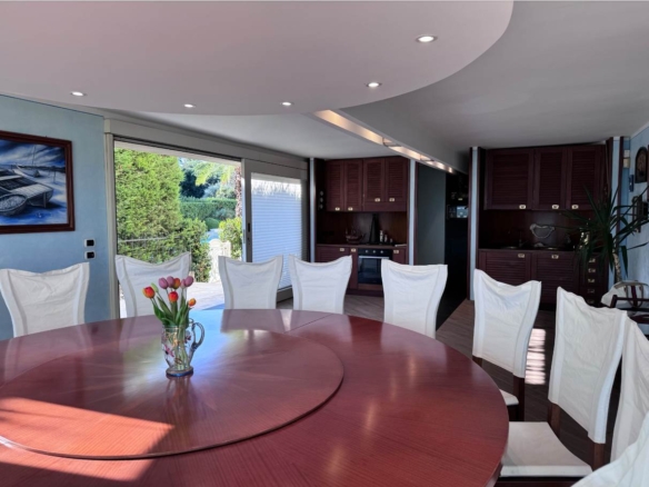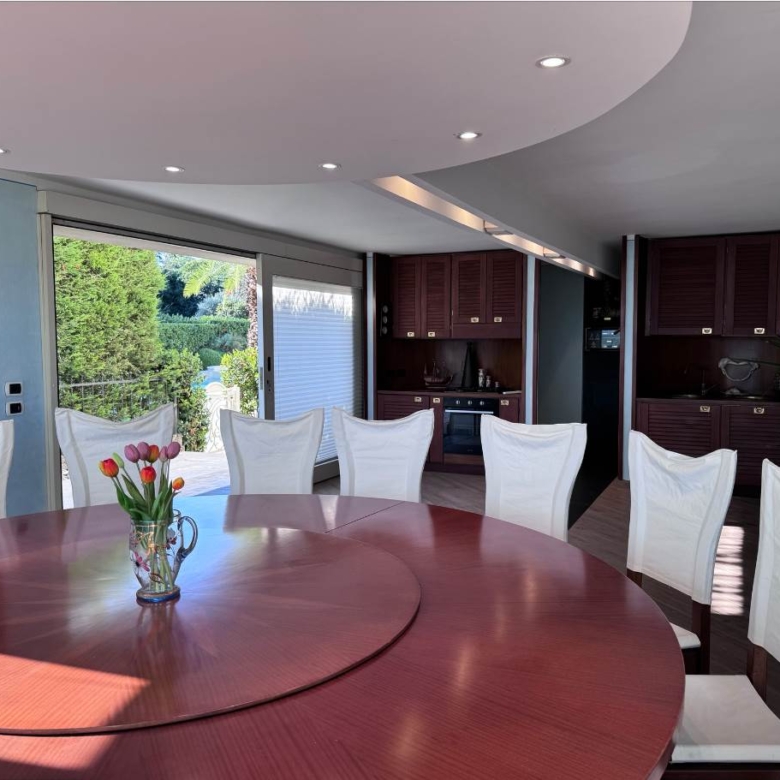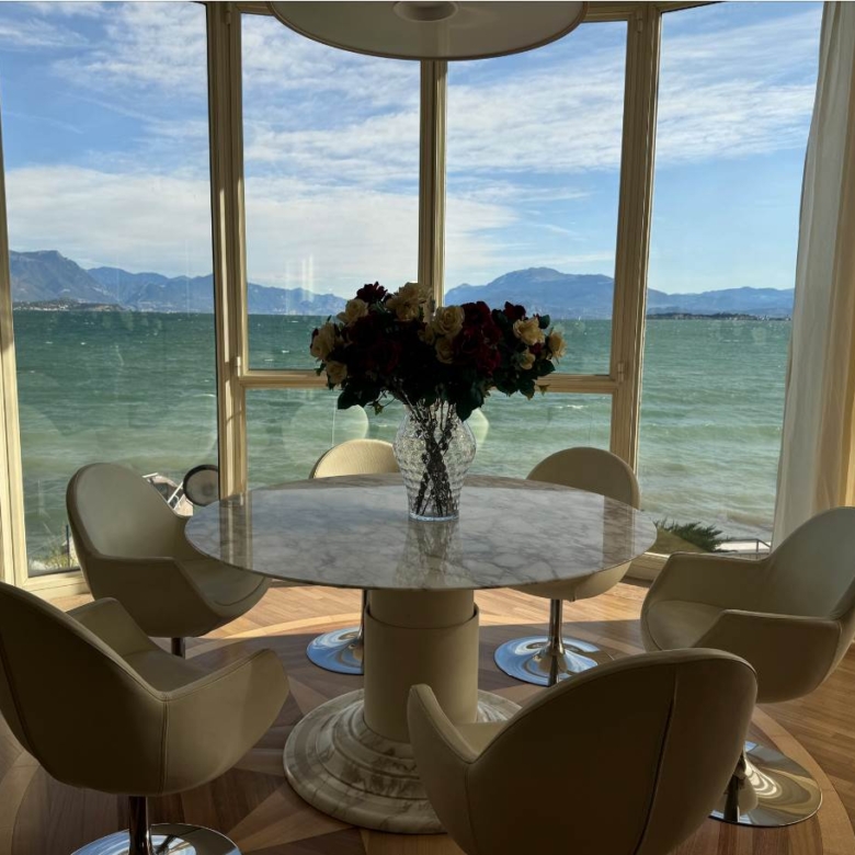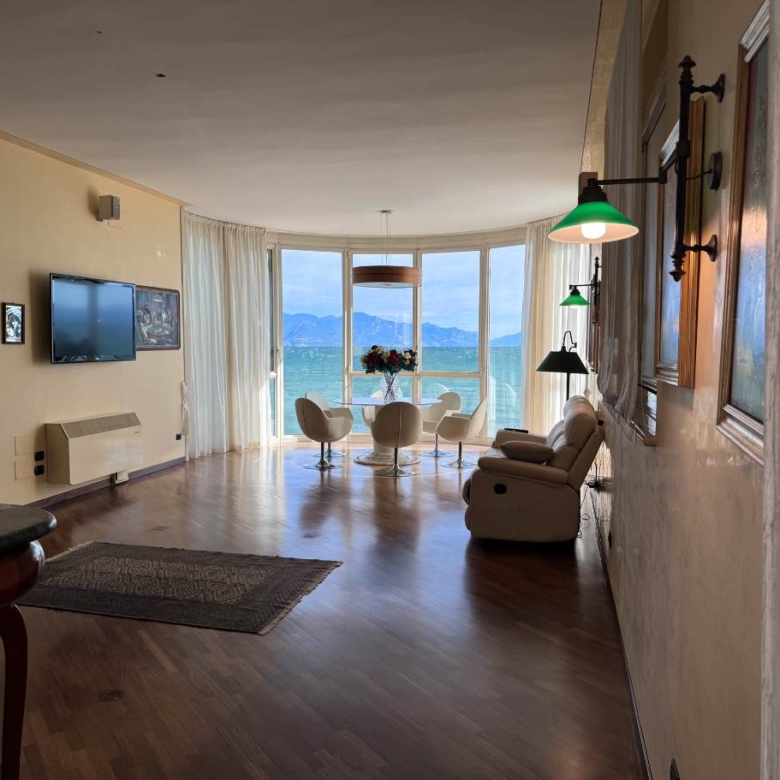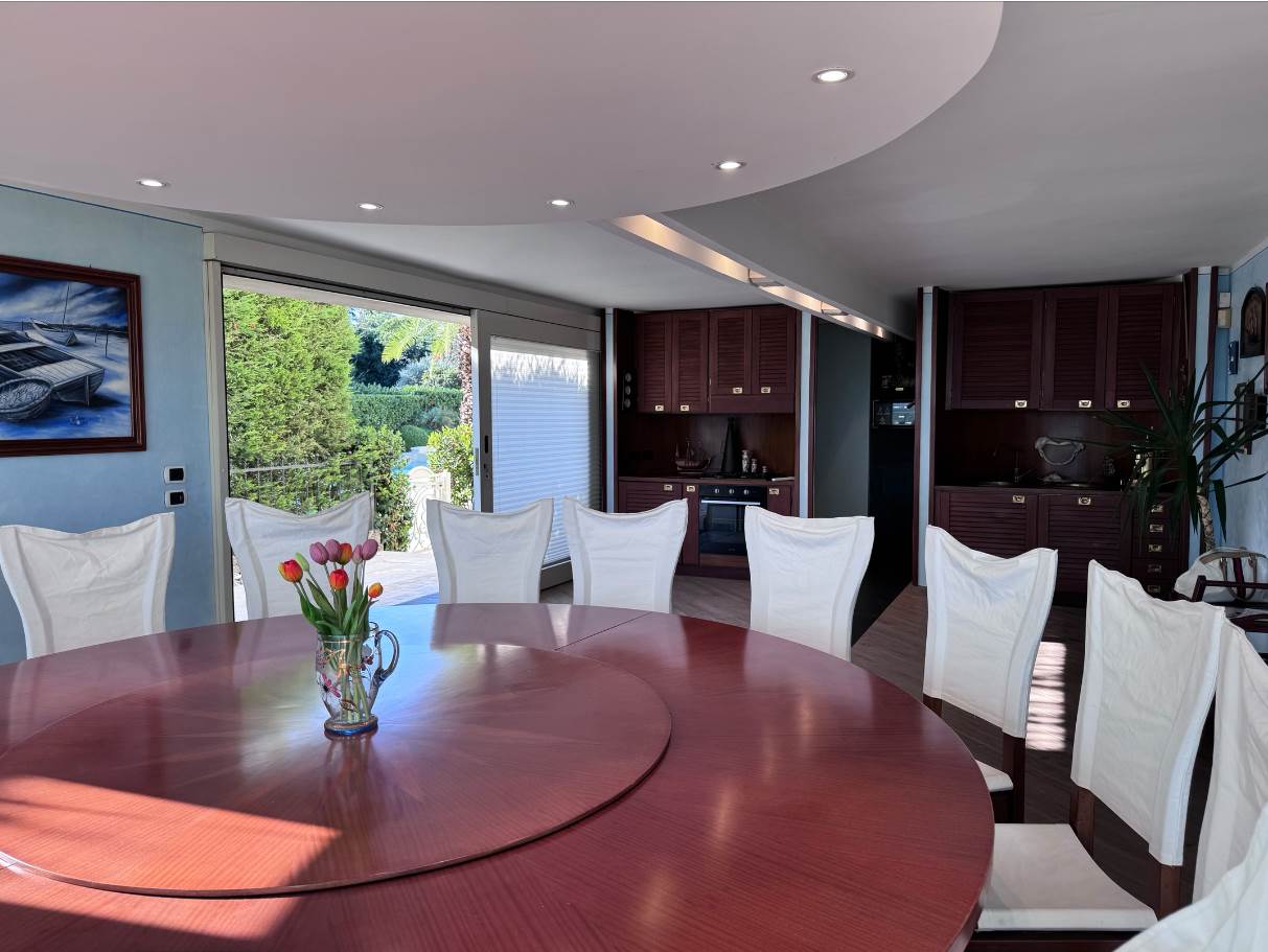 Al piano terra troviamo la prima zona living molto luminosa con accesso diretto sia alla terrazza di 50 mq fronte lago sia alla piscina condominiale, cucina a vista, bagno di servizio, ripostiglio con locale tecnico; l’ importante tavolo con pedana rotante permette a tutti i commensali una vista incantevole su Sirmione.