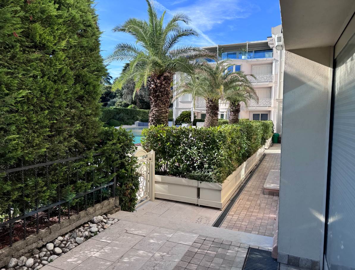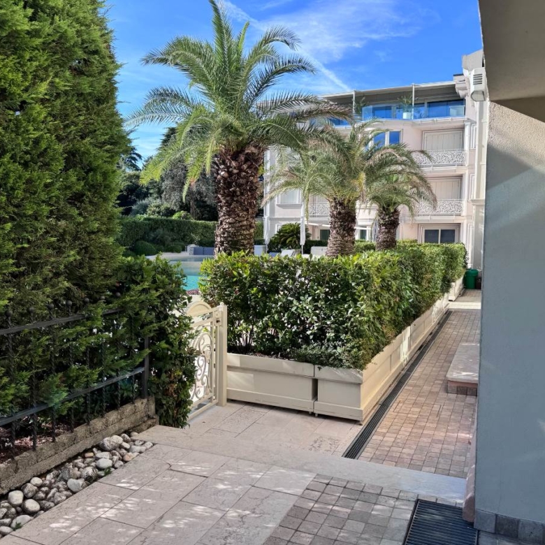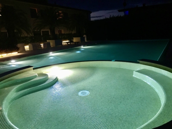 Zona comune con accesso al lago, accesso diretto alla piscina condominiale dotata di idromassaggio e area lettini/ prendisole.