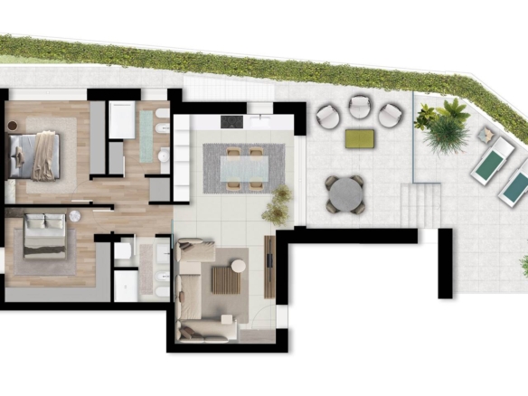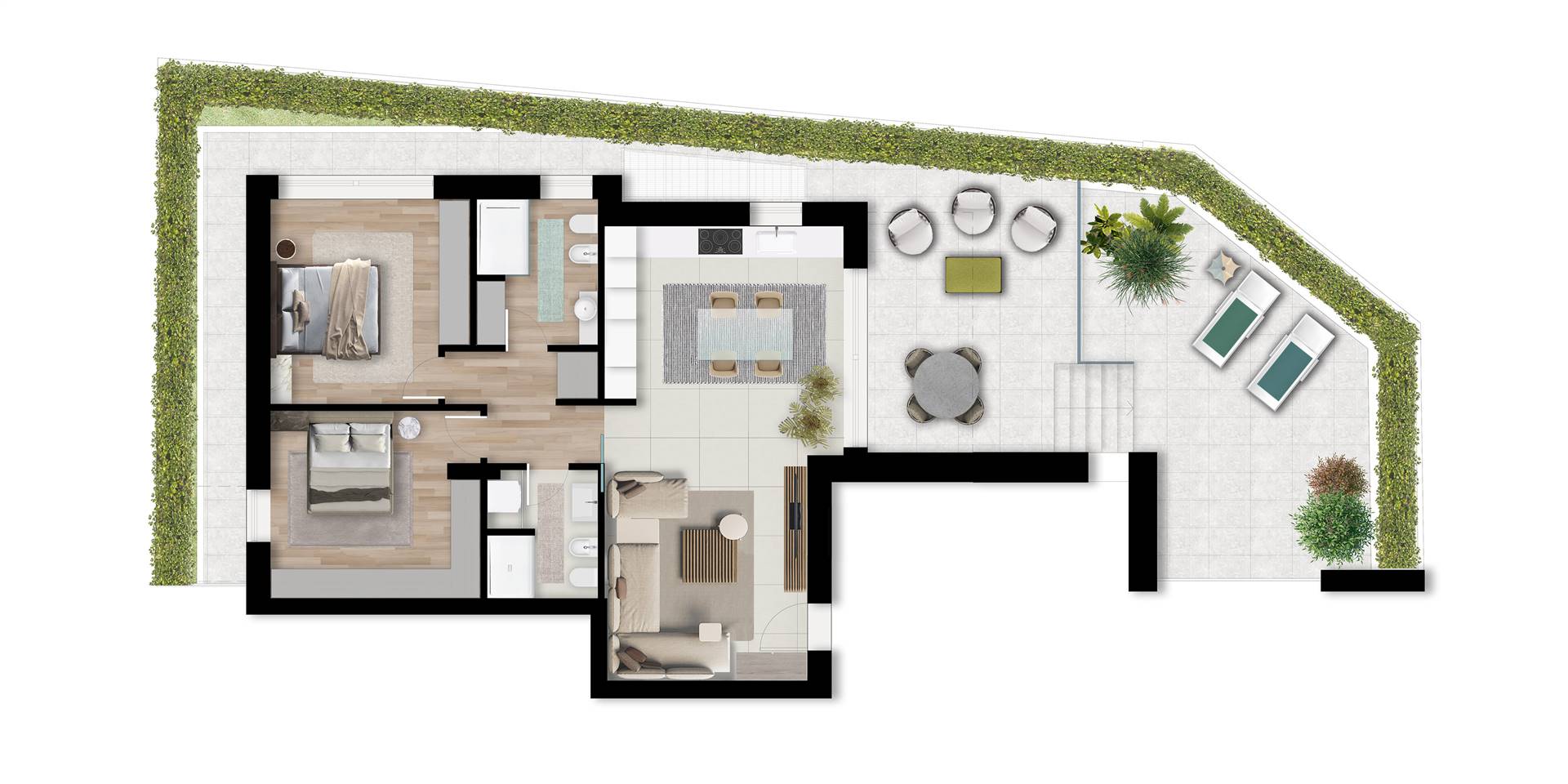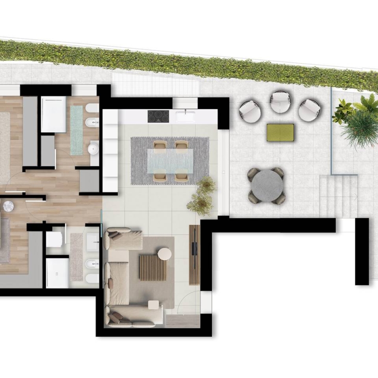 Il TRILOCALE al piano terra composto da soggiorno con angolo cottura, due bagni e due camere matrimoniali, mentre l’area esterna comprende un porticato e un lastrico solare .Completa la proprietà un box auto.