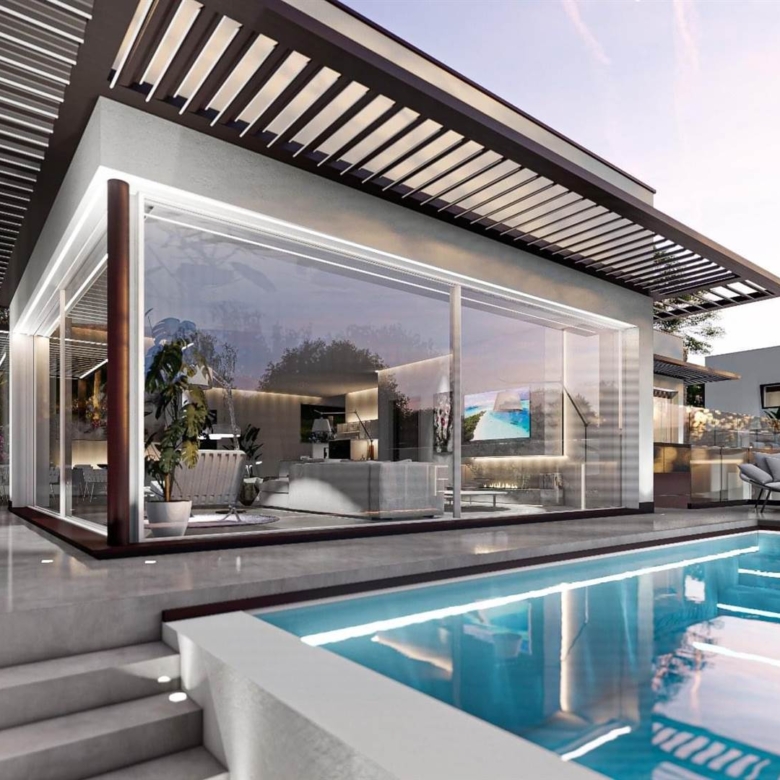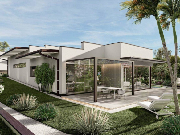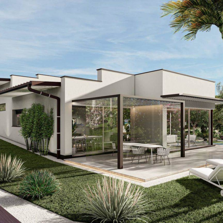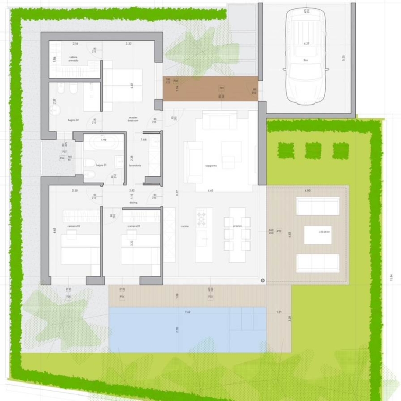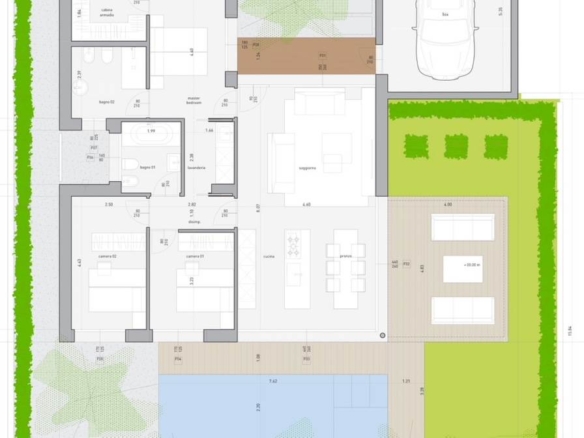 La villa è composta da sei vani, tra cui tre camere da letto spaziose e due bagni eleganti, ideali per famiglie o per chi desidera un ampio spazio. La cucina, con un pratico angolo cottura, si integra perfettamente con un soggiorno doppio luminoso, creando un ambiente accogliente e conviviale.
